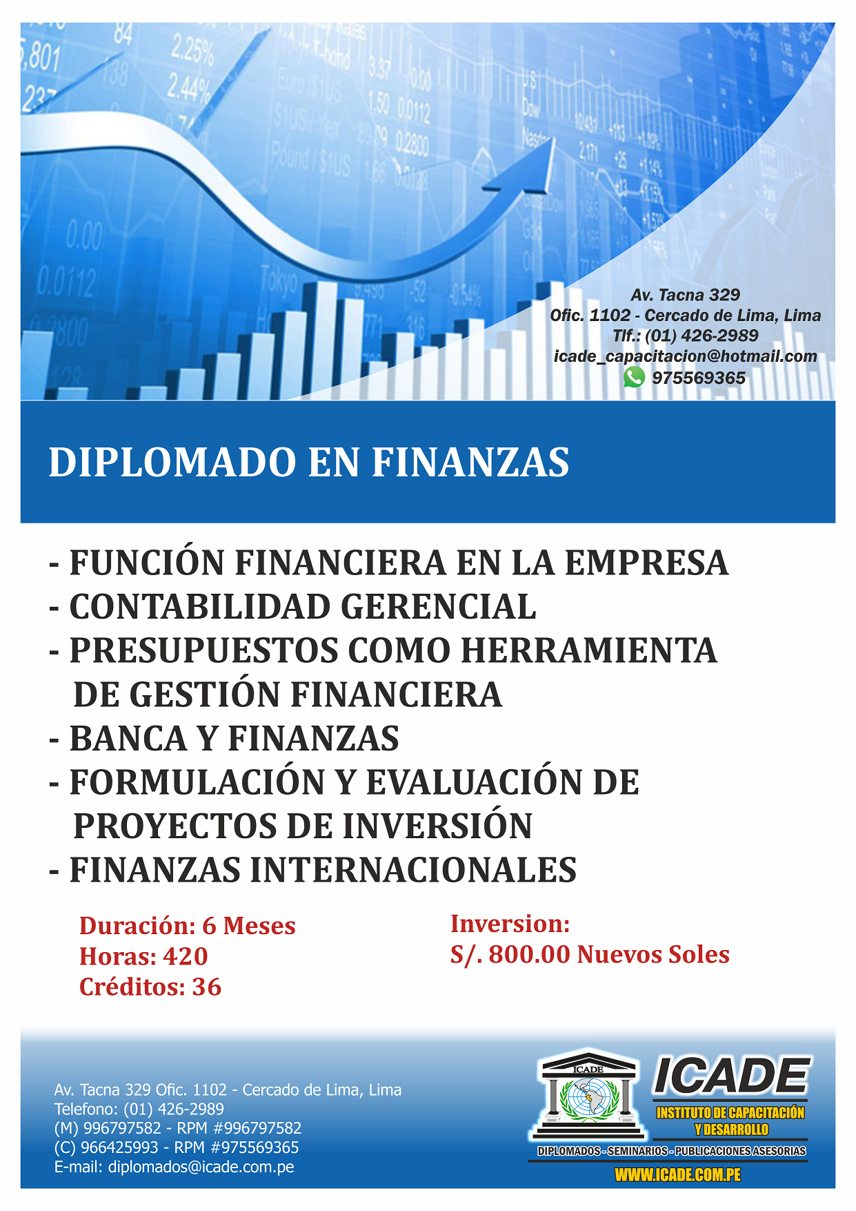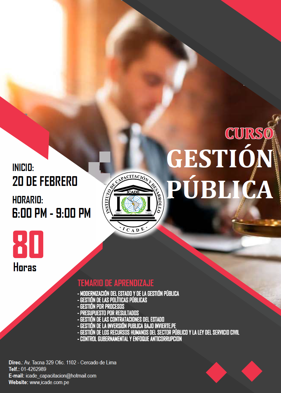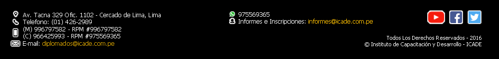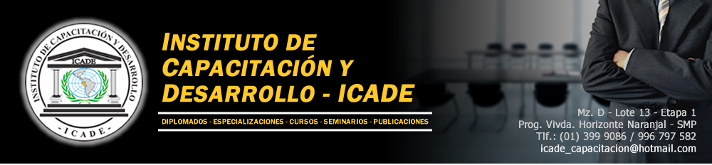 El Instituto de Capacitación y Desarrollo - ICADE, les da su más cordial bienvenida a su portal Institucional; y esa bienvenida se da porque sin duda nos sentimos muy satisfechos por ser parte y actor del universo que nos configura. Esto es lo que hace que ICADE se haya convertido en un paradigma inconfundible en la capacitación, investigación y especialización profesional en el Perú.